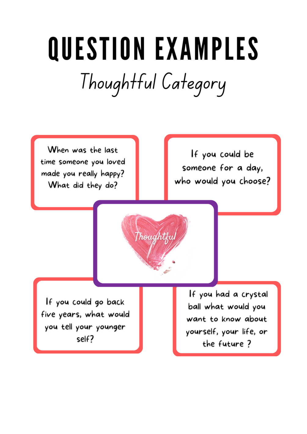 Careful curation - I have been a relationship writer/coach for a few years and these questions have been tried and tested in the field! The questions are designed to be more “feeling” questions instead of “factual” or “yes/no” questions to encourage conversation and intimacy