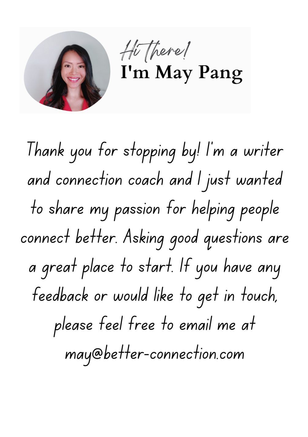 I would welcome your feedback on the cards or even any questions of your own that you may want to add for future decks. Please message me or email me at may@better-connection.com.
